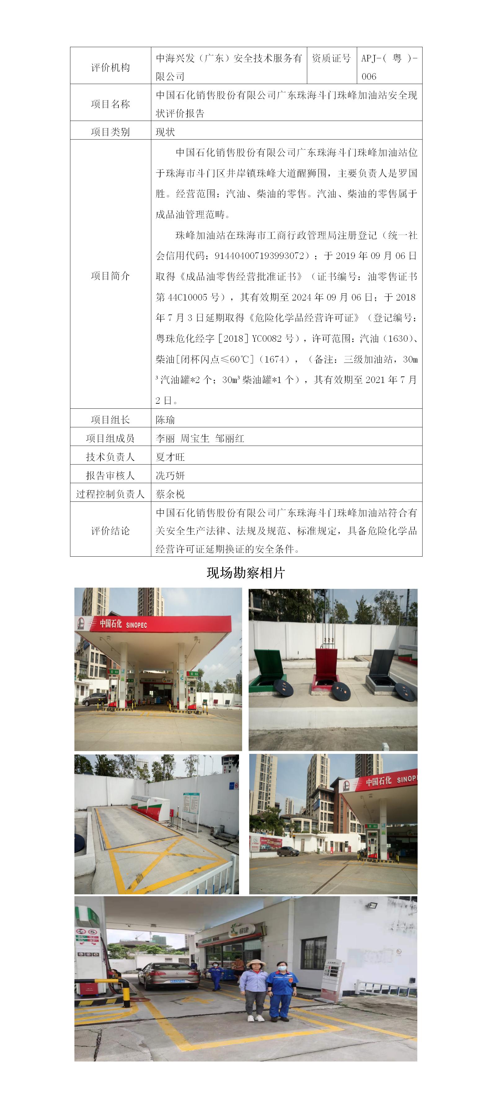 中国石化销售股份有限公司广东珠海翠微加油站安全现状评价报告【2021年】