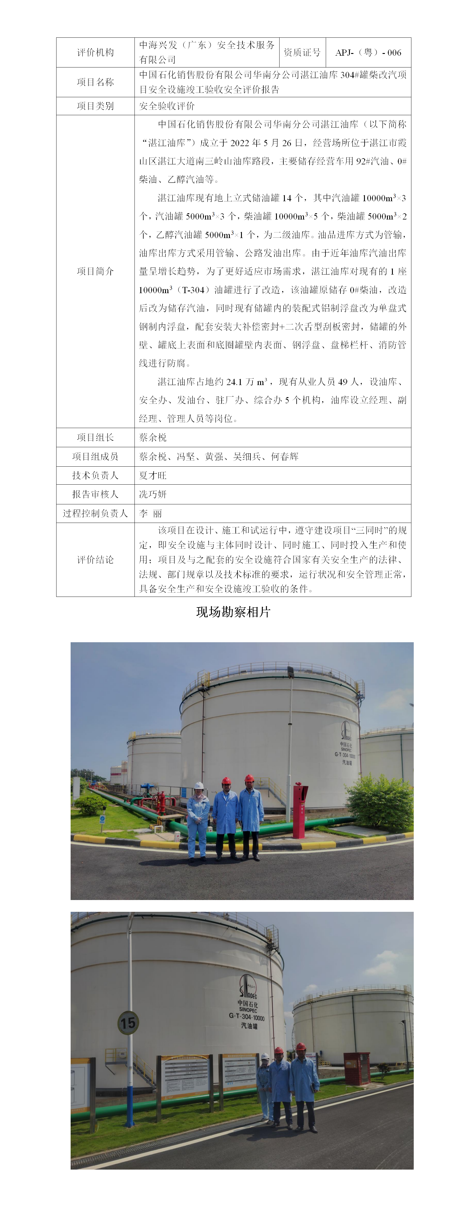 中国石化销售股份有限公司华南分公司湛江油库304#罐柴改汽项目安全设施竣工验收安全评价报告