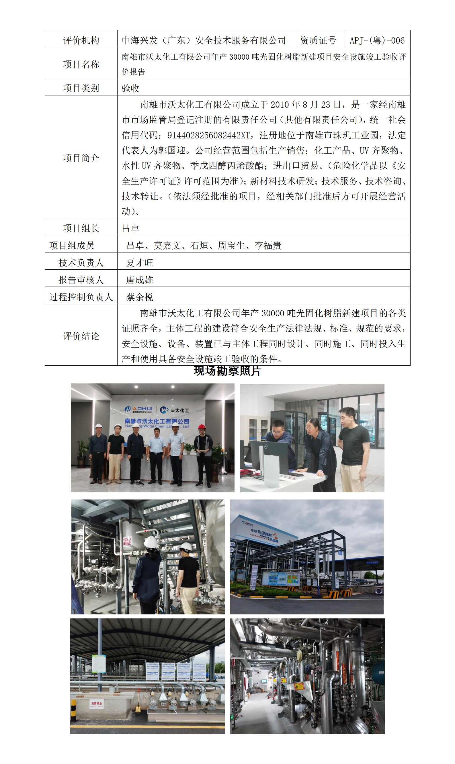 南雄市沃太化工有限公司年产30000吨光固化树脂新建项目安全设施竣工验收评价报告