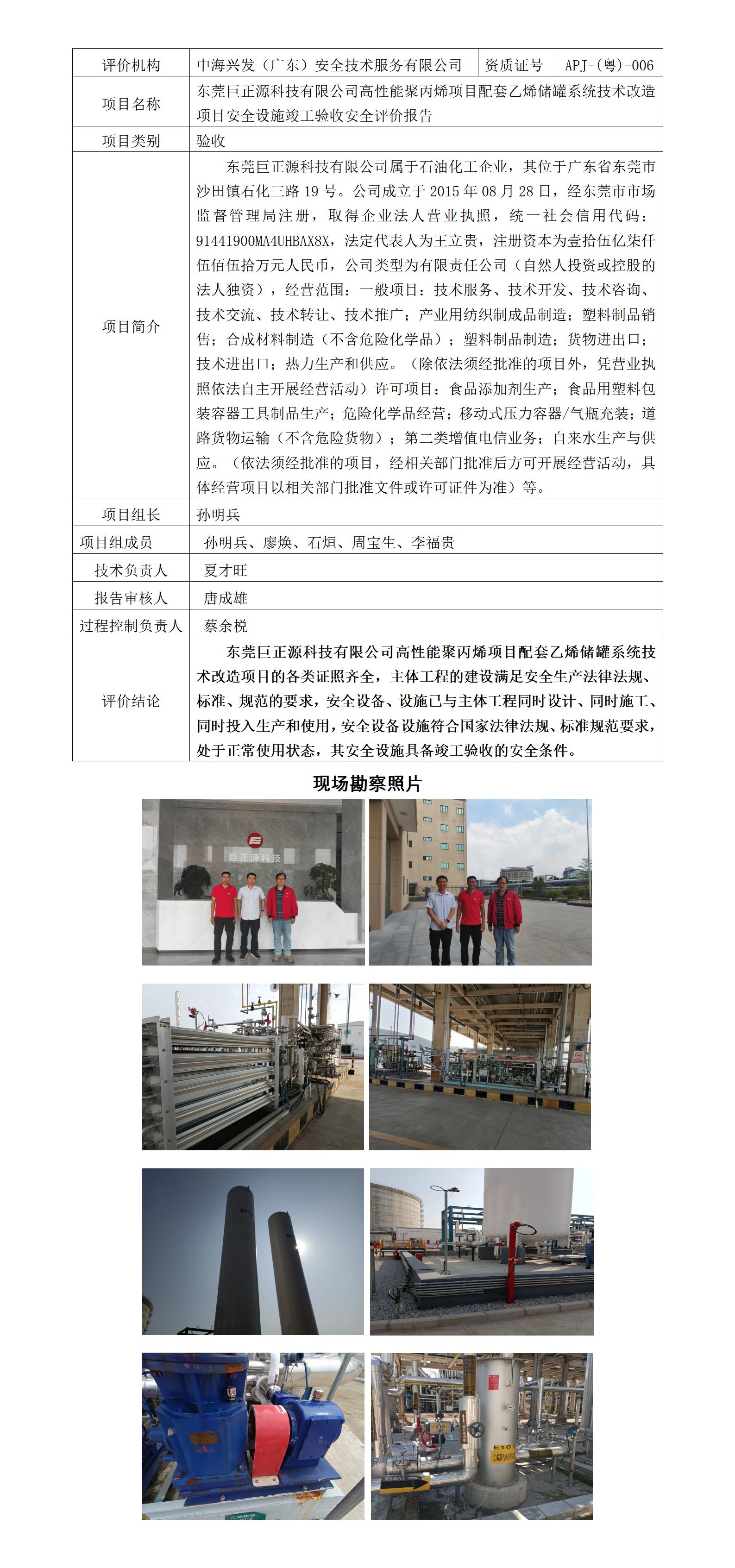 东莞巨正源科技有限公司高性能聚丙烯项目配套乙烯储罐系统技术改造项目安全设施竣工验收安全评价报告