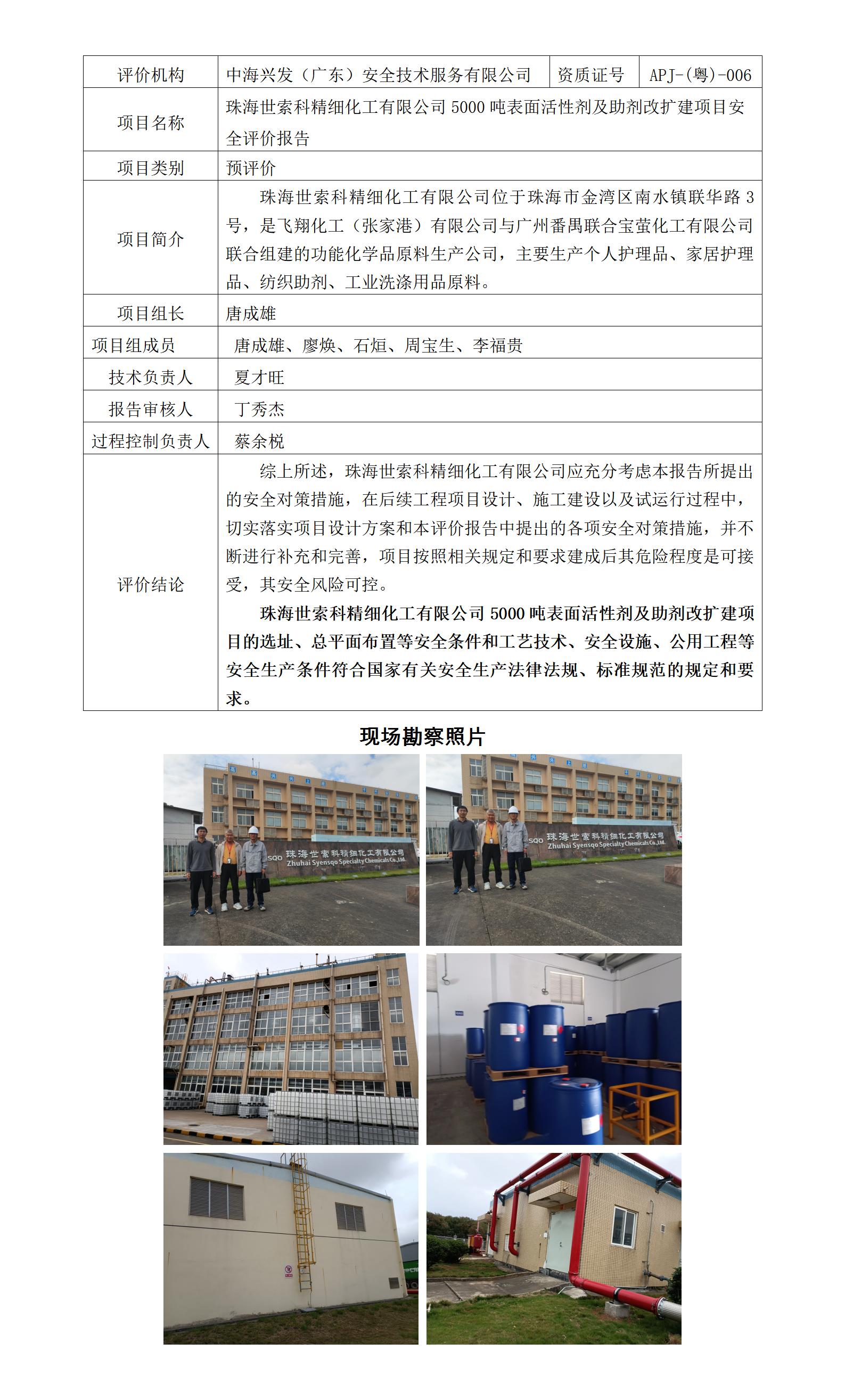 珠海世索科精细化工有限公司5000吨表面活性剂及助剂改扩建项目安全评价报告