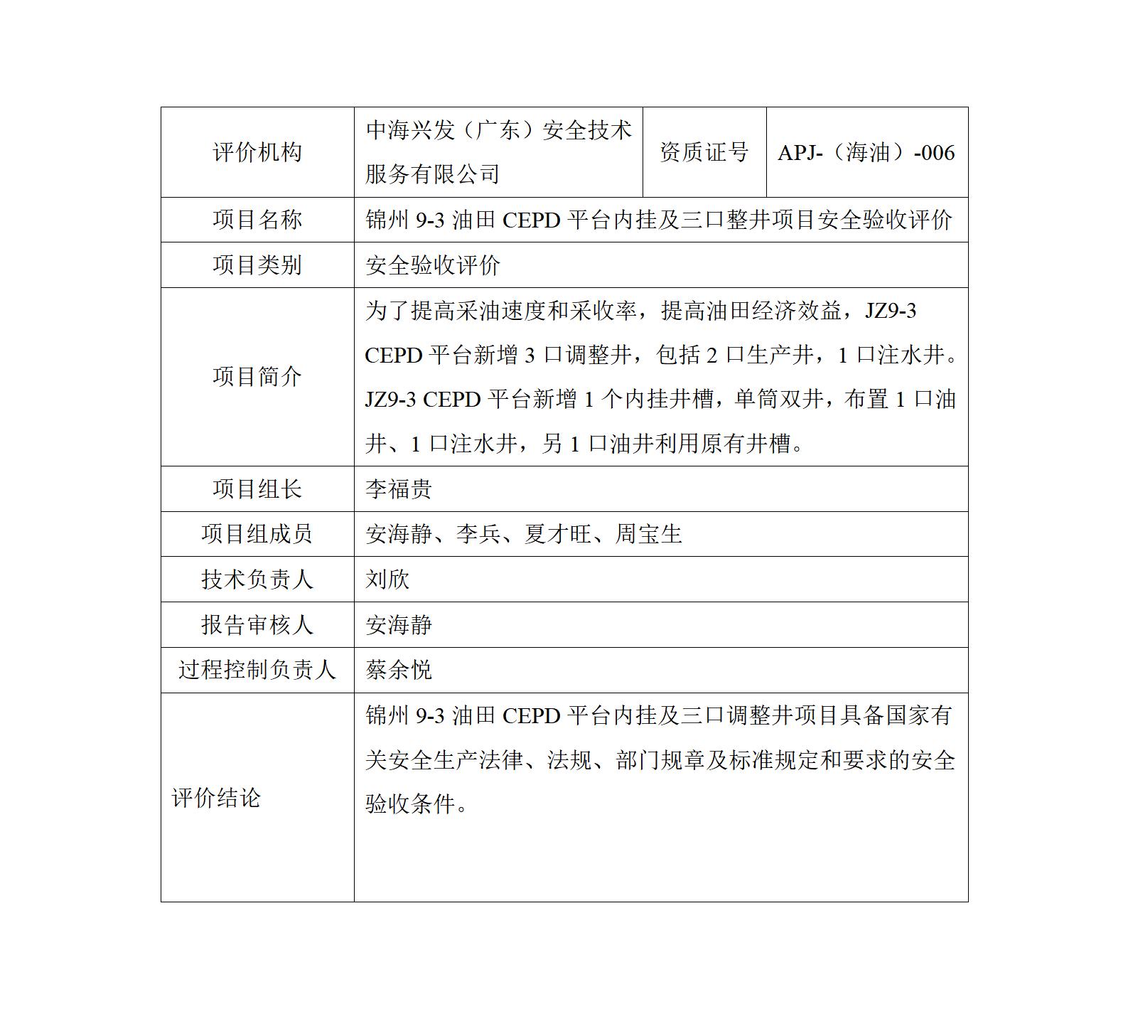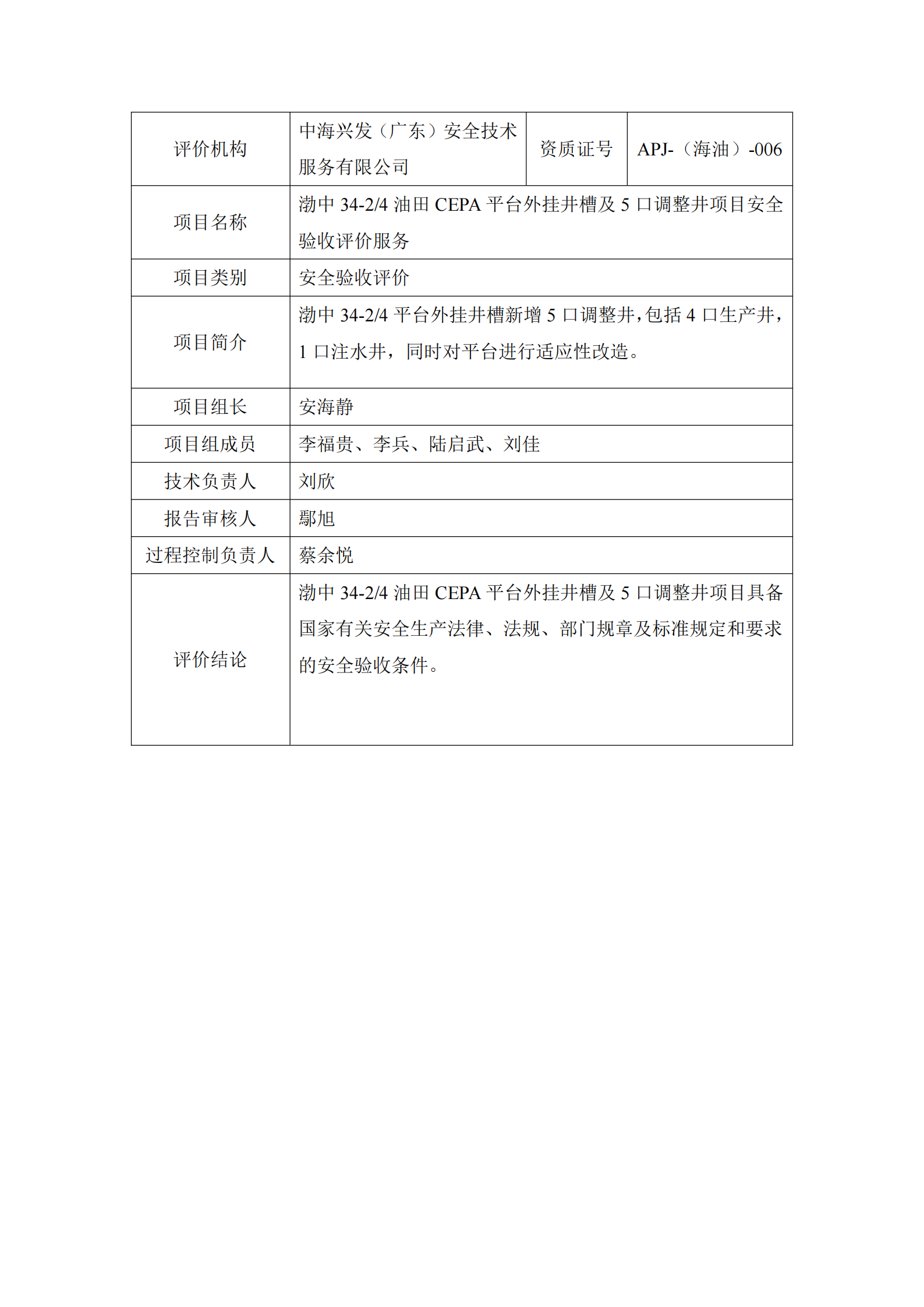 渤中34-2/4油田CEPA平台外挂井槽及5口调整井项目安全验收评价服务