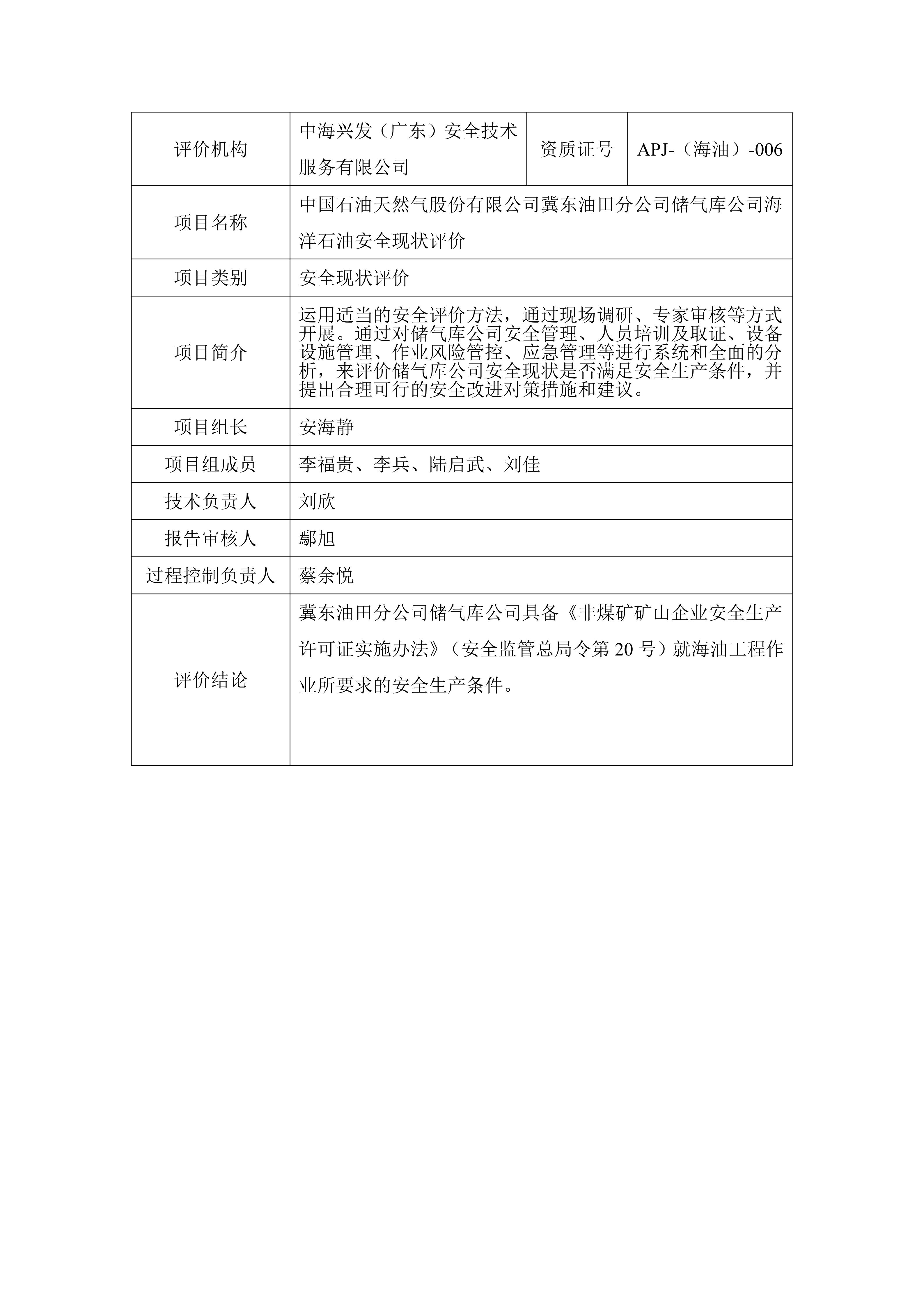 中国石油天然气股份有限公司冀东油田分公司储气库公司海洋石油安全现状评价