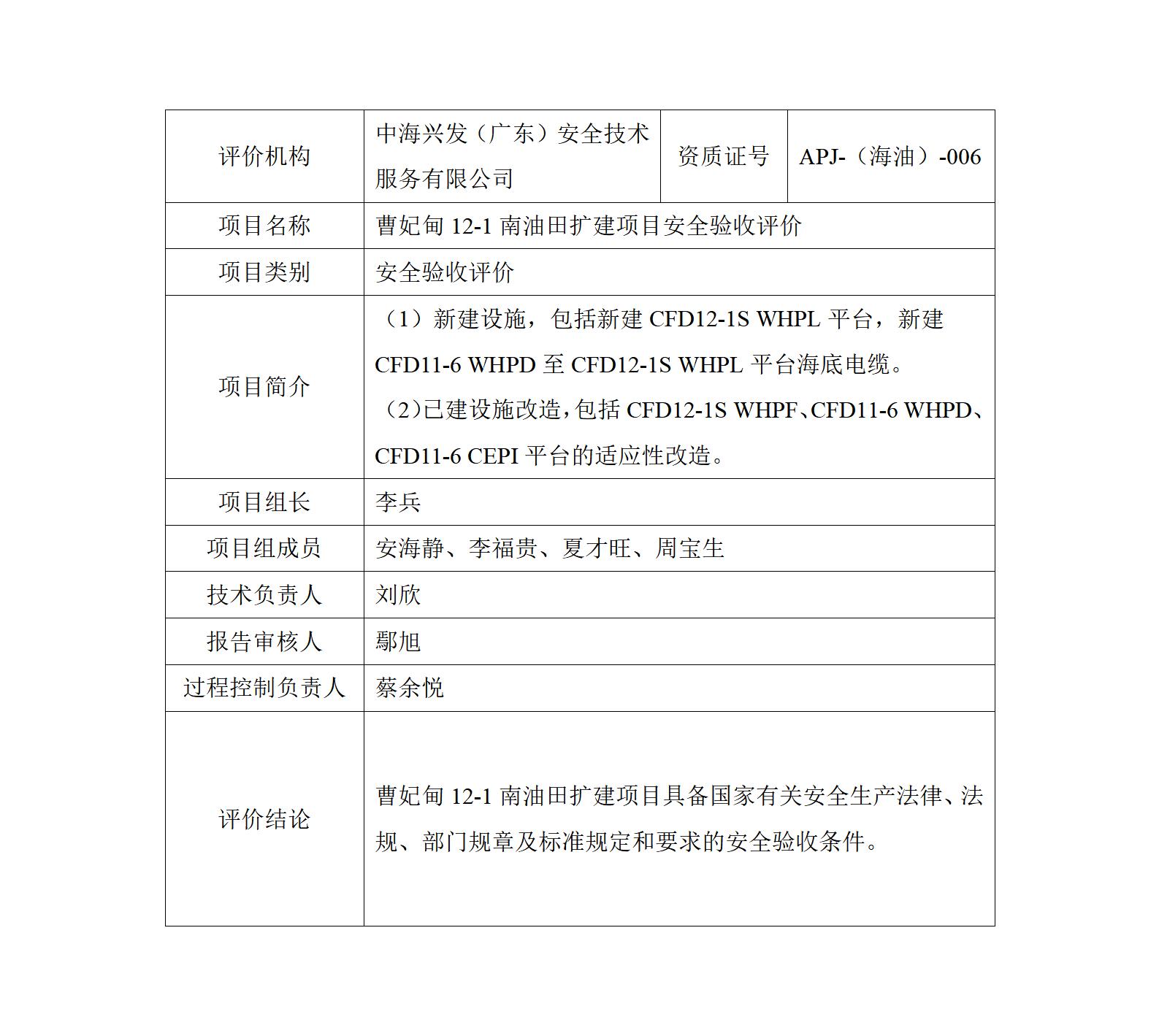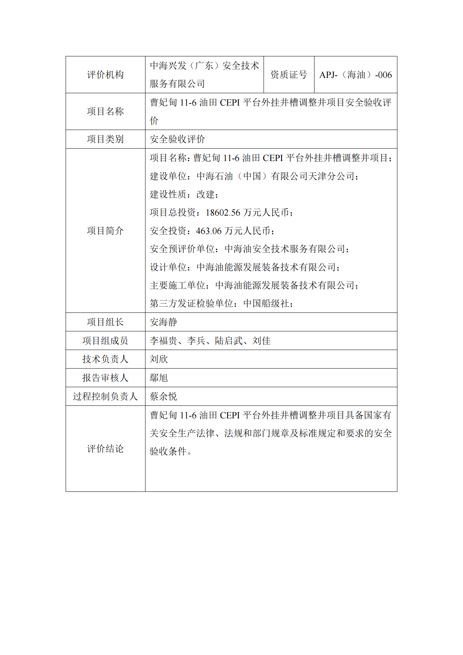 曹妃甸11-6油田CEPI平台外挂井槽调整井项目安全验收评价